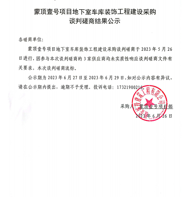 蒙頂壹號項(xiàng)目地下室車庫裝飾工程建設(shè)采購談判磋商結(jié)果公示