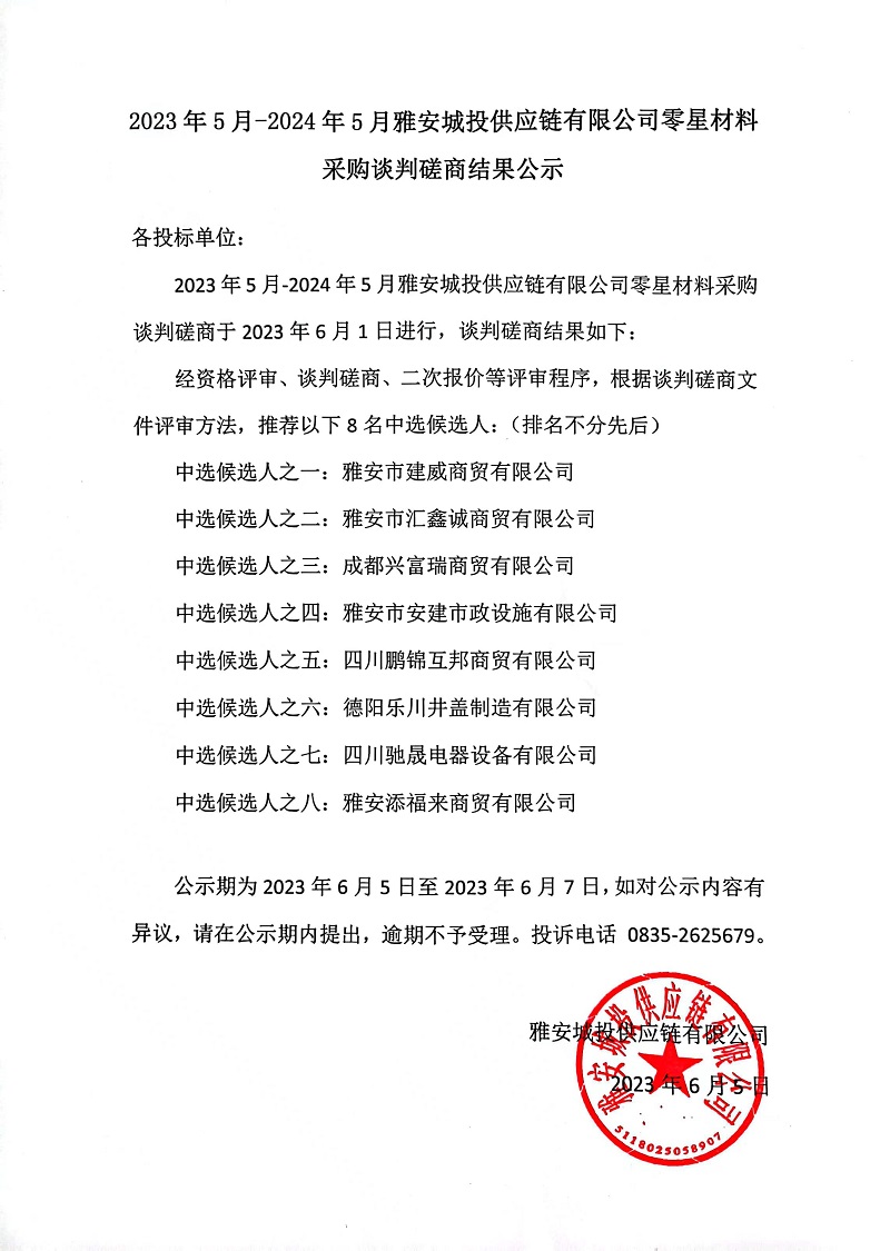 2023年5月-2024年5月雅安城投供應(yīng)鏈有限公司零星材料采購談判磋商結(jié)果公示