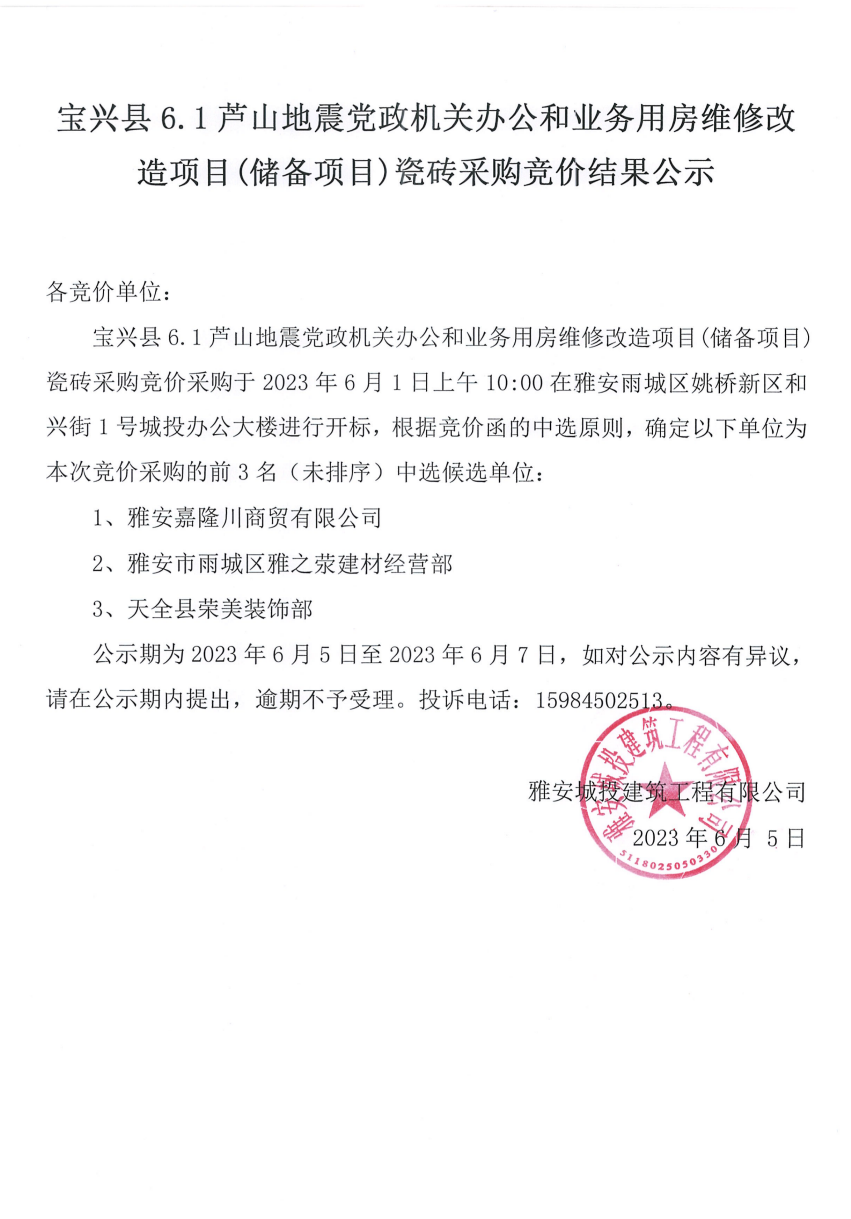 寶興縣6.1蘆山地震黨政機關辦公和業(yè)務用房維修改造項目(儲備項目)瓷磚采購競價結果公示