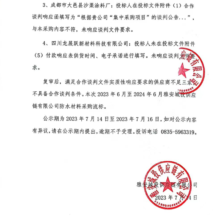 2023年6月至2024年6月雅安城投供應鏈有限公司防水材料合作談判采購結(jié)果公示