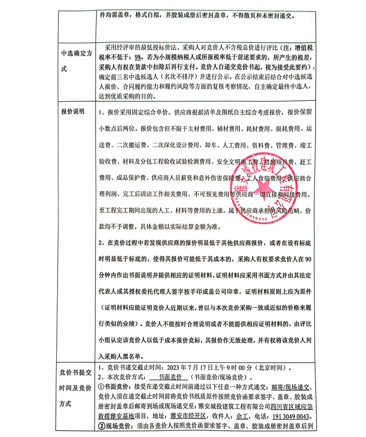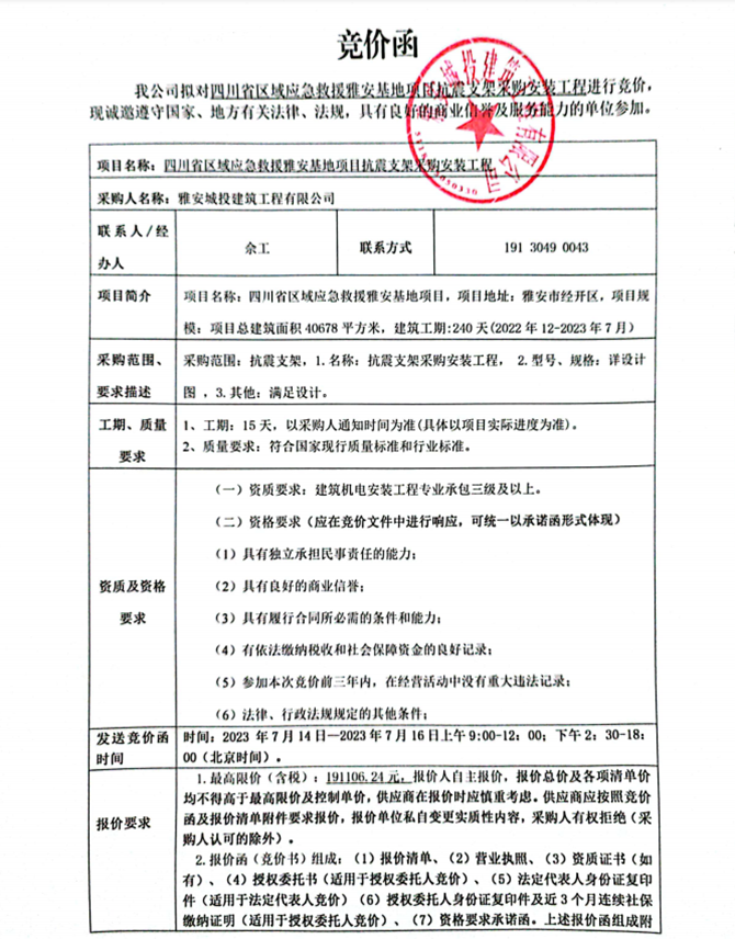 四川省區(qū)域應(yīng)急救援雅安基地項(xiàng)目抗震支架采購安裝工程競價(jià)公告