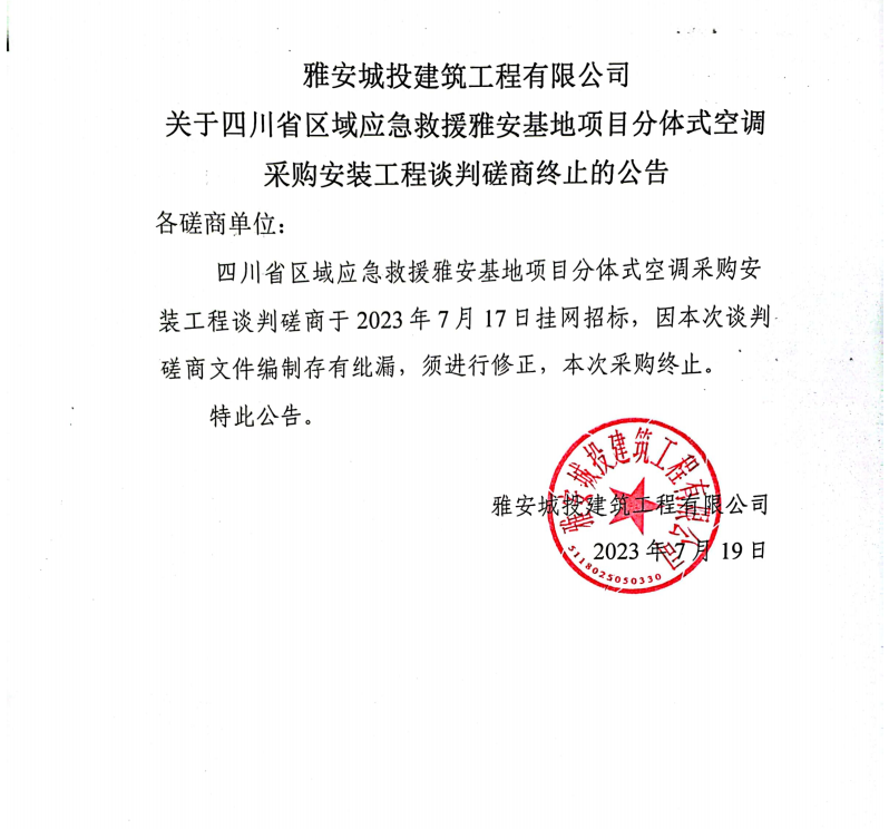 雅安城投建筑工程有限公司關(guān)于四川省區(qū)域應(yīng)急救援雅安基地項目分體式空調(diào)采購安裝工程談判磋商終止的公告
