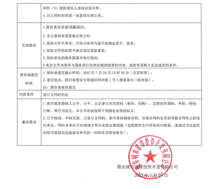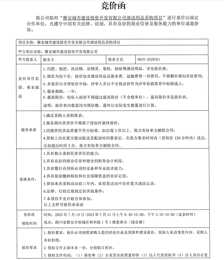 雅安城市建設(shè)投資開發(fā)有限公司清潔用品采購項目競價公告
