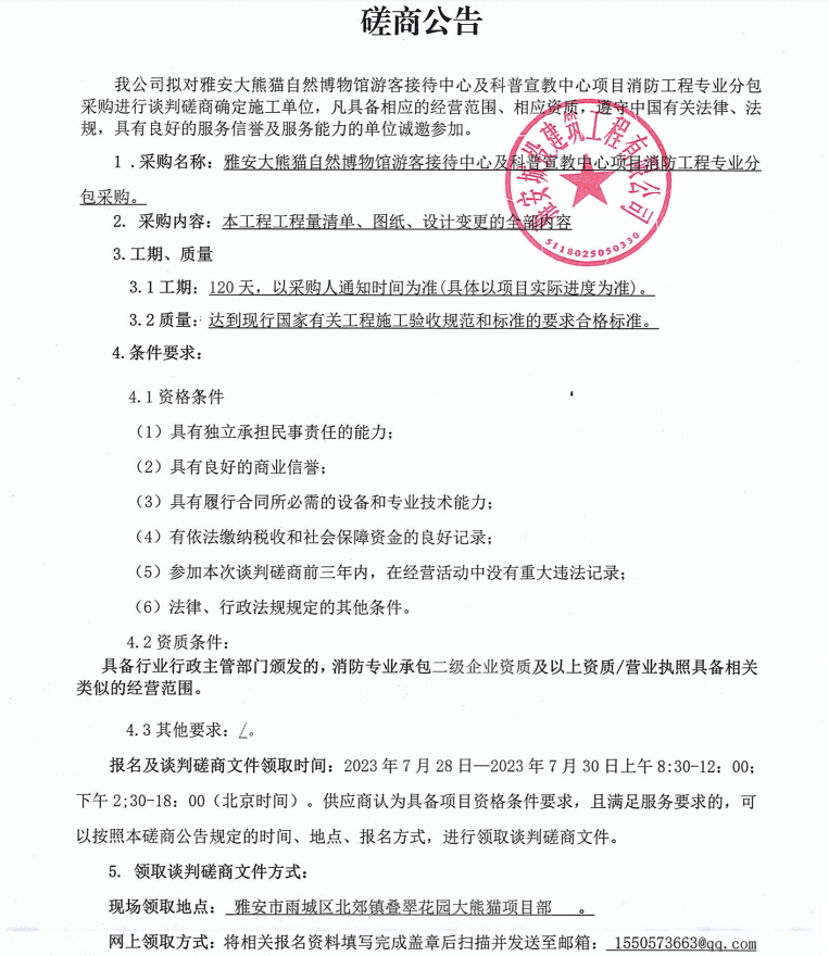 雅安大熊貓自然博物館游客接待中心及科普宣教中心項(xiàng)目消防工程專業(yè)分包采購(gòu)談判磋商公告