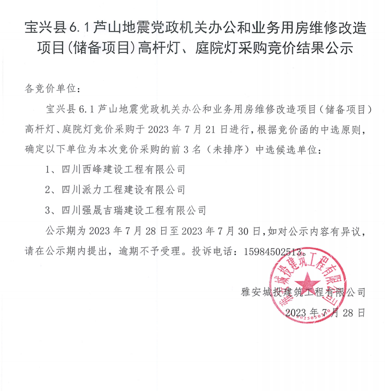 寶興縣6.1蘆山地震黨政機關(guān)辦公和業(yè)務(wù)用房維修改造項目(儲備項目)高桿燈、庭院燈采購競價結(jié)果公示