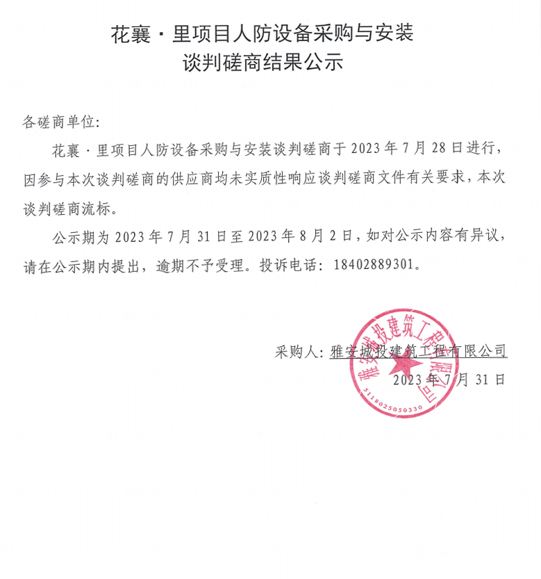 花襄·里項(xiàng)目人防設(shè)備采購(gòu)與安裝談判磋商結(jié)果公示