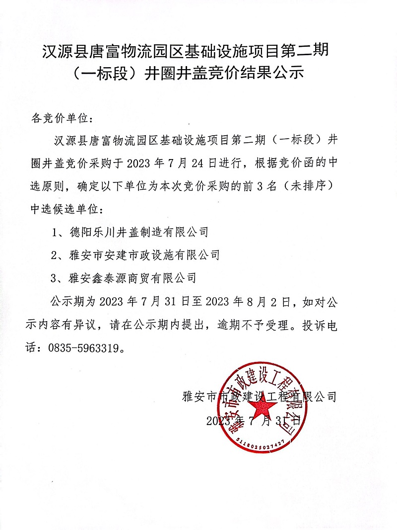 漢源縣唐富物流園區(qū)基礎(chǔ)設(shè)施項目第二期(一標(biāo)段)井圈井蓋采購競價結(jié)果公示