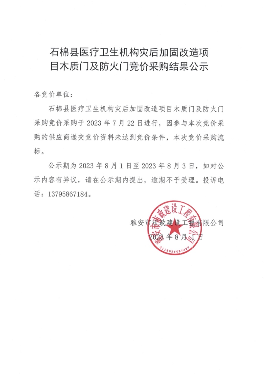 石棉縣醫(yī)療衛(wèi)生機(jī)構(gòu)災(zāi)后加固改造項(xiàng)目木質(zhì)門(mén)及防火門(mén)競(jìng)價(jià)采購(gòu)結(jié)果公示