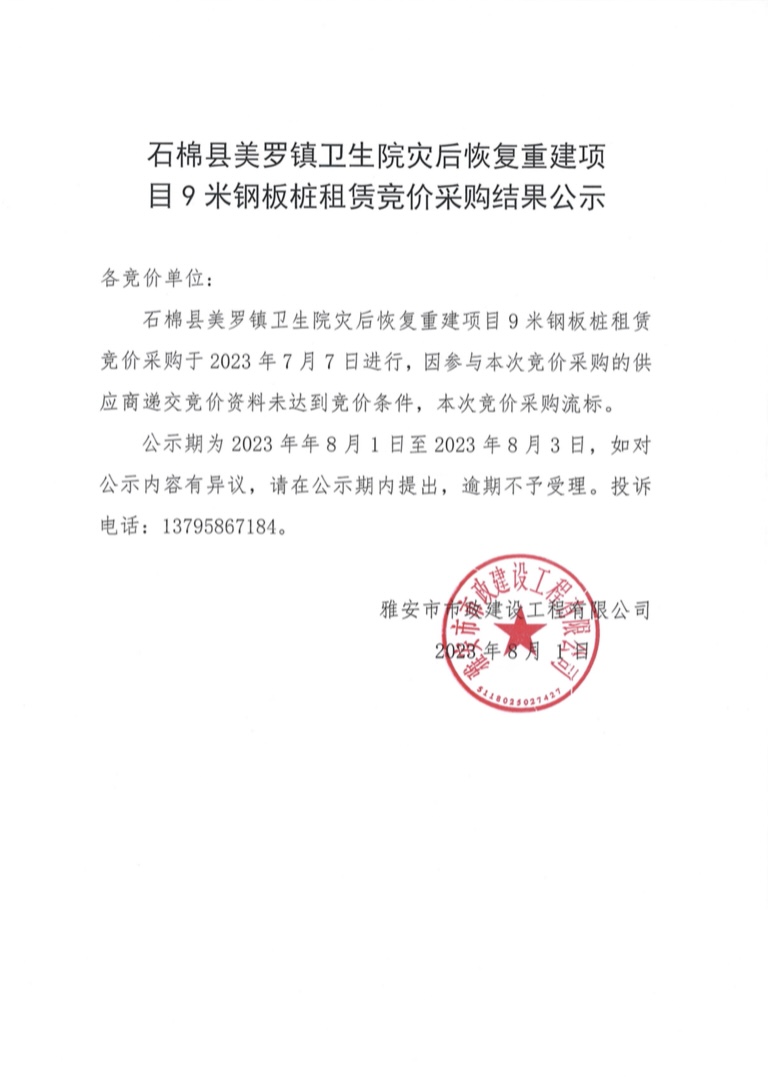 石棉縣美羅鎮(zhèn)衛(wèi)生院災(zāi)后恢復(fù)重建項(xiàng)目9米鋼板樁租賃競(jìng)價(jià)采購(gòu)結(jié)果公示