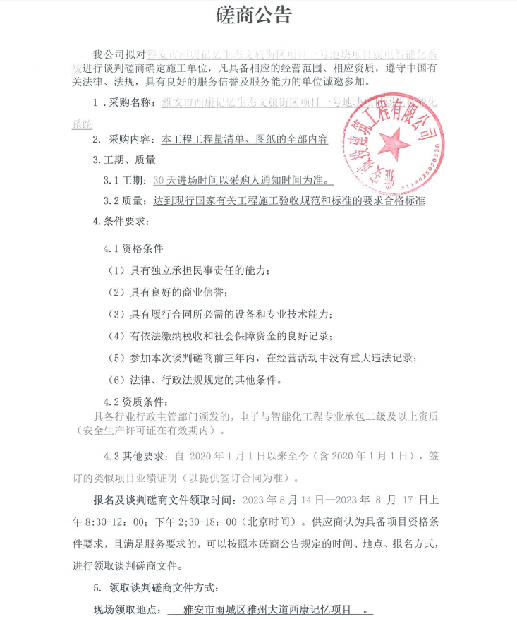 雅安市西康記憶生態(tài)文旅街區(qū)項(xiàng)目一號(hào)地塊項(xiàng)目弱電智能化系統(tǒng)談判磋商公告