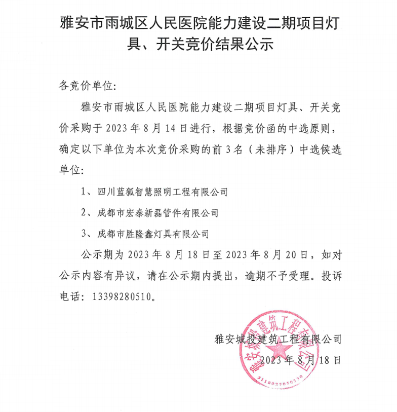 雅安市雨城區(qū)人民醫(yī)院能力建設二期項目燈具、開關競價結果公示