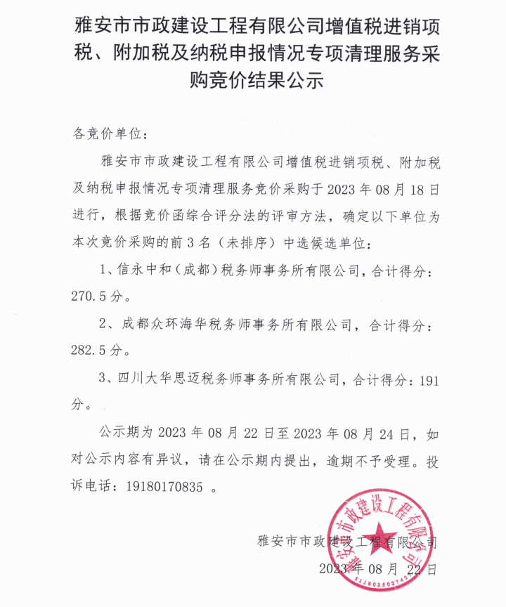 雅安市市政建設(shè)工程有限公司增值稅進(jìn)銷項稅、附加稅及納稅申報情況專項清理服務(wù)采購競價結(jié)果公示