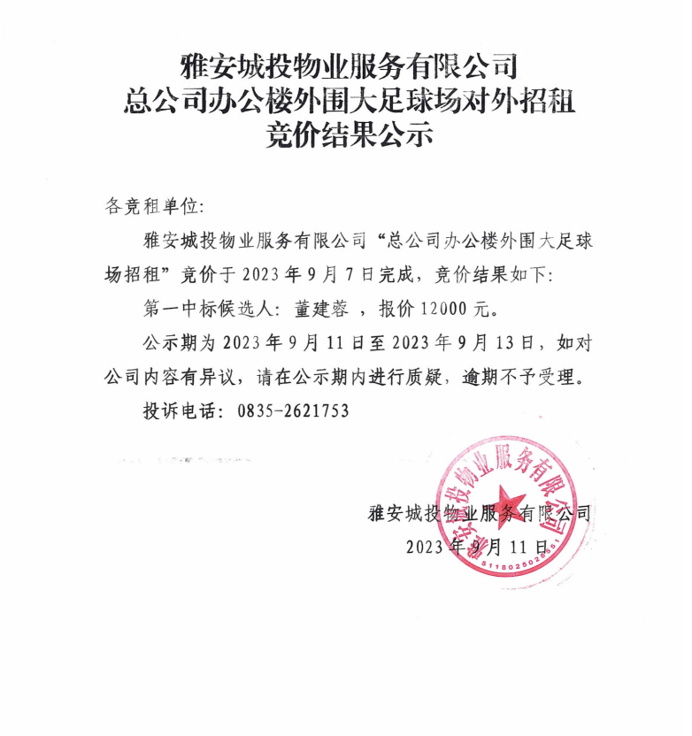 雅安城投物業(yè)服務(wù)有限公司總公司辦公樓外圍大足球場對外招租競價結(jié)果公示