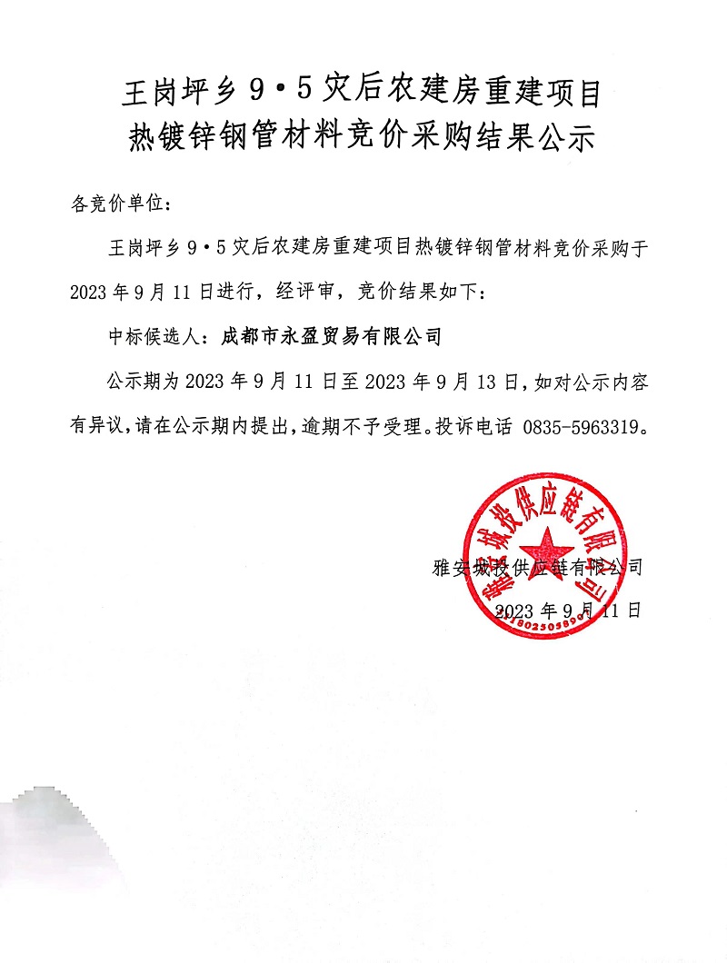 王崗坪鄉(xiāng)9.5災(zāi)后農(nóng)建房重建項(xiàng)目熱鍍鋅鋼管材料競價(jià)采購結(jié)果公示