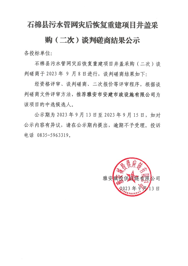 石棉縣污水管網(wǎng)災(zāi)后恢復(fù)重建項(xiàng)目井蓋采購(gòu)(二次)談判磋商結(jié)果公示