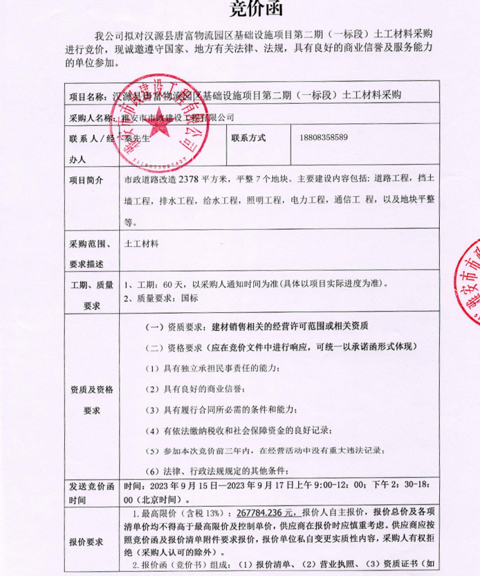 漢源縣唐富物流園區(qū)基礎(chǔ)設(shè)施項(xiàng)目第二期(一標(biāo)段)土工材料采購競(jìng)價(jià)公告