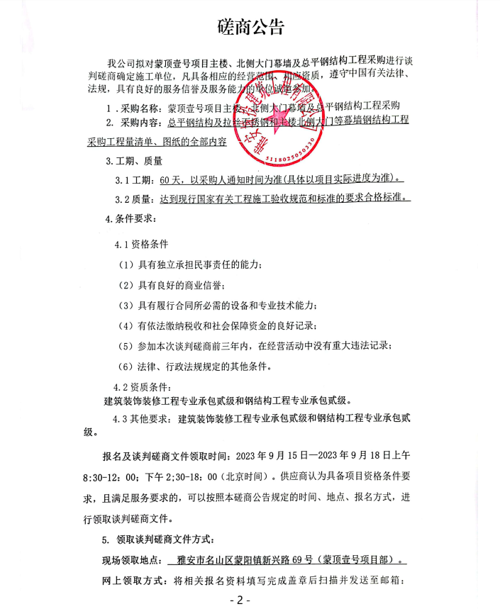 蒙頂壹號(hào)項(xiàng)目主樓、北側(cè)大門幕墻及總平鋼結(jié)構(gòu)工程采購(gòu)談判磋商公告