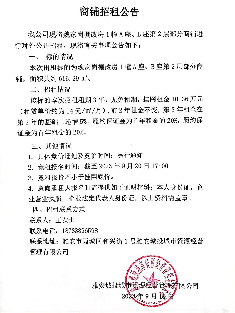 魏家崗棚改房1幢A座、B座第2層部分商鋪招租公告