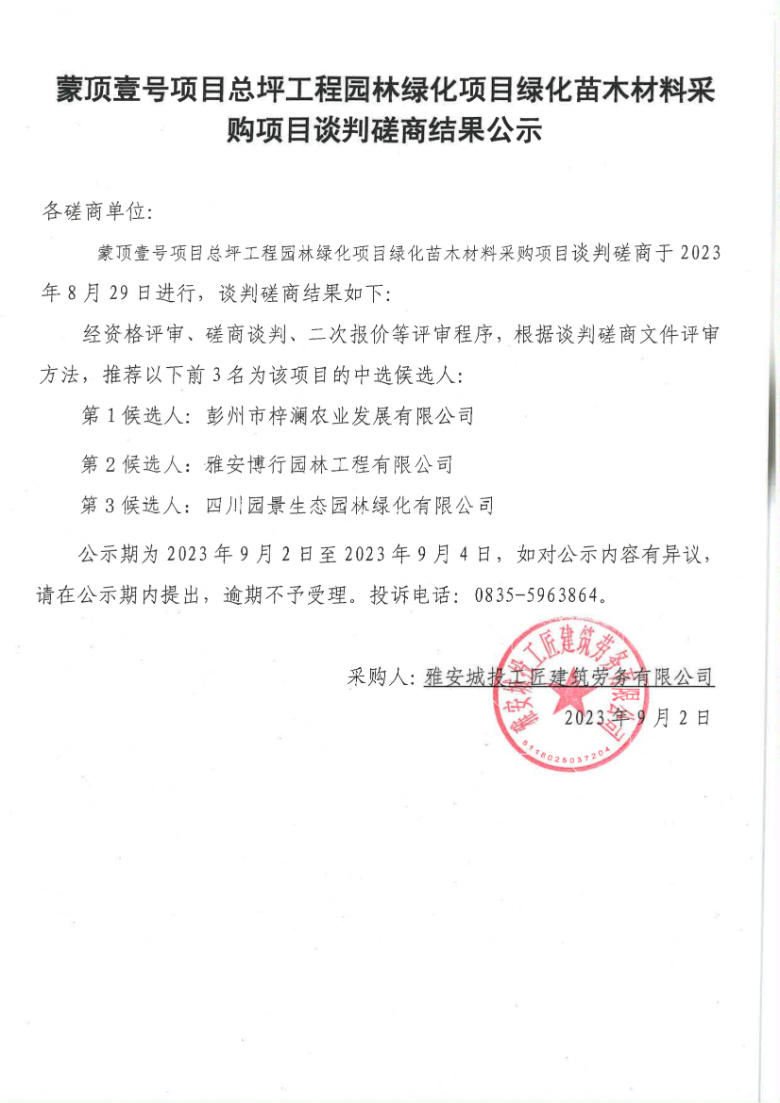 蒙頂壹號(hào)項(xiàng)目總坪工程園林綠化項(xiàng)目綠化苗木材料采購(gòu)項(xiàng)目談判磋商結(jié)果公示