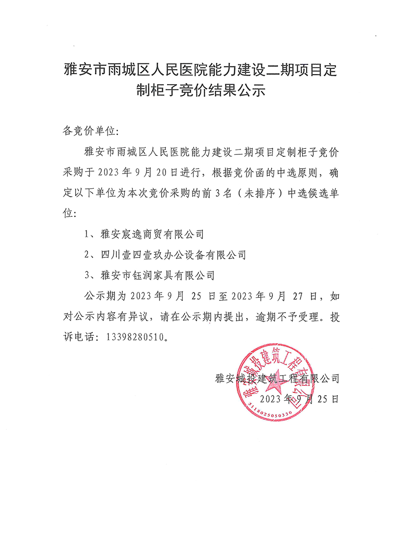 雅安市雨城區(qū)人民醫(yī)院能力建設(shè)二期項目定制柜子競價結(jié)果公示