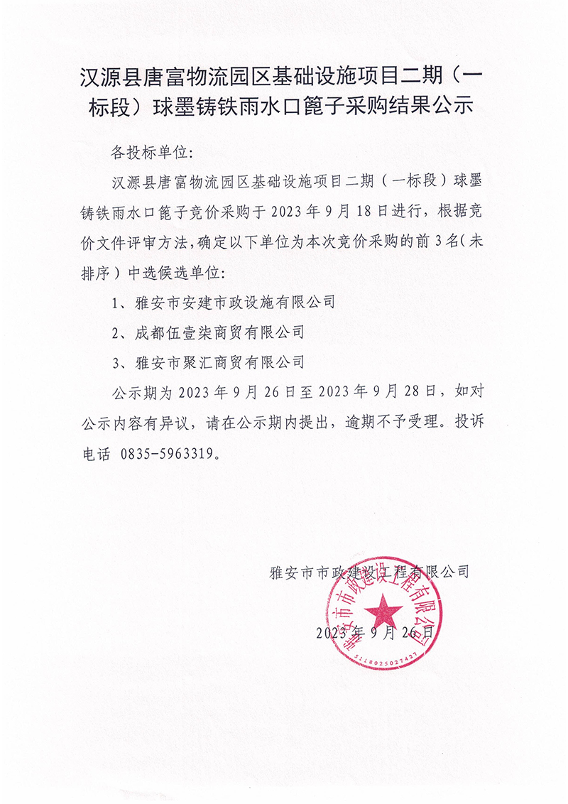 漢源縣唐富物流園區(qū)基礎(chǔ)設(shè)施項(xiàng)目二期(一標(biāo)段)球墨鑄鐵雨水口篦子采購(gòu)結(jié)果公示