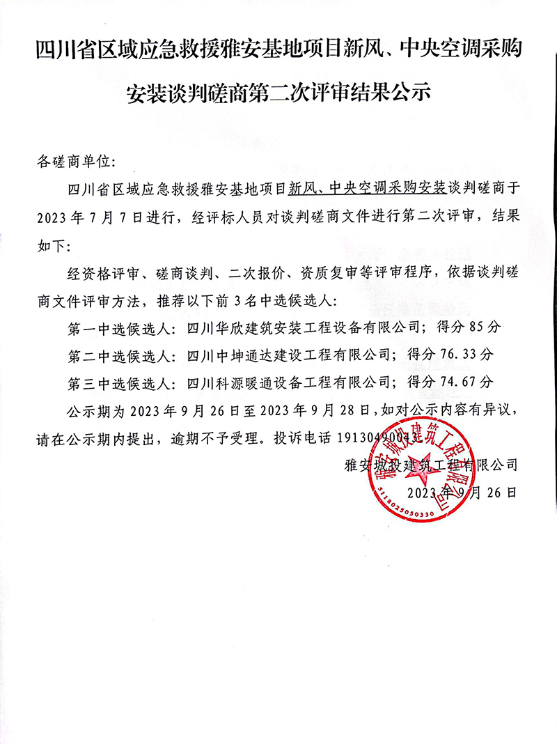 四川省區(qū)域應急救援雅安基地項目新風、中央空調(diào)采購安裝談判磋商第二次評審結果公示