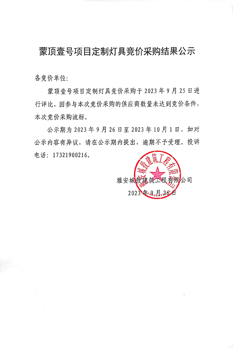 蒙頂壹號(hào)項(xiàng)目定制燈具競(jìng)價(jià)采購結(jié)果公示