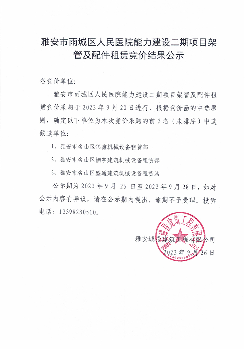 雅安市雨城區(qū)人民醫(yī)院能力建設二期項目架管及配件租賃競價結果公示