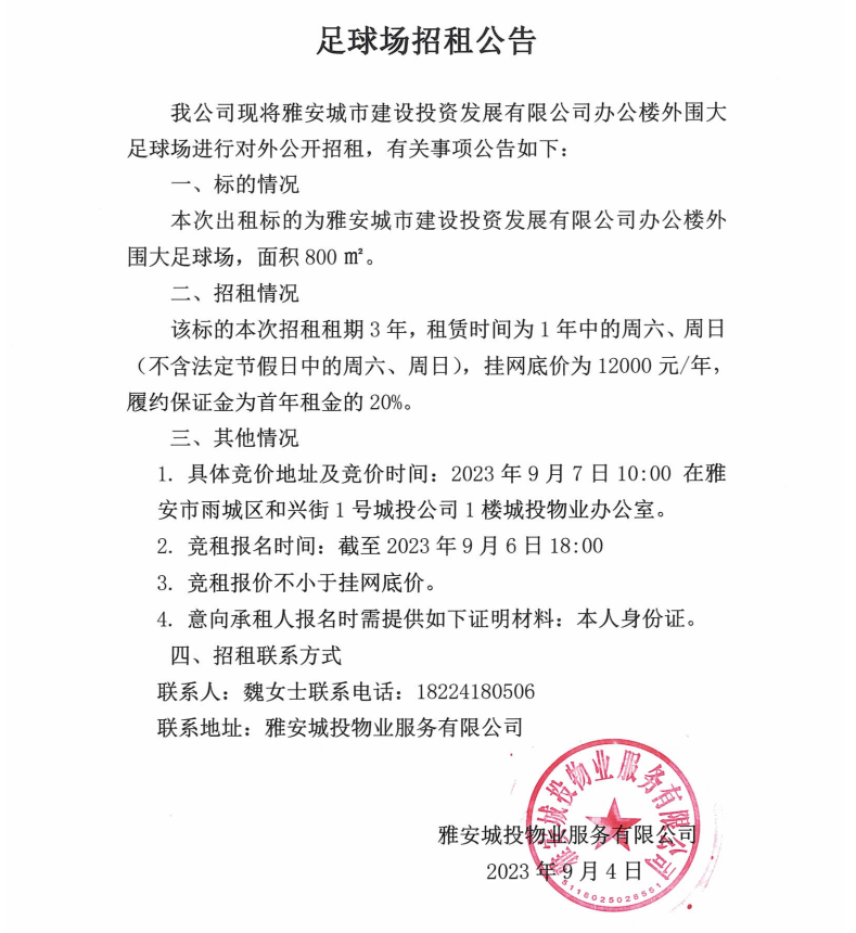 雅安城市建設投資開發(fā)有限公司外圍大足球場招租公告