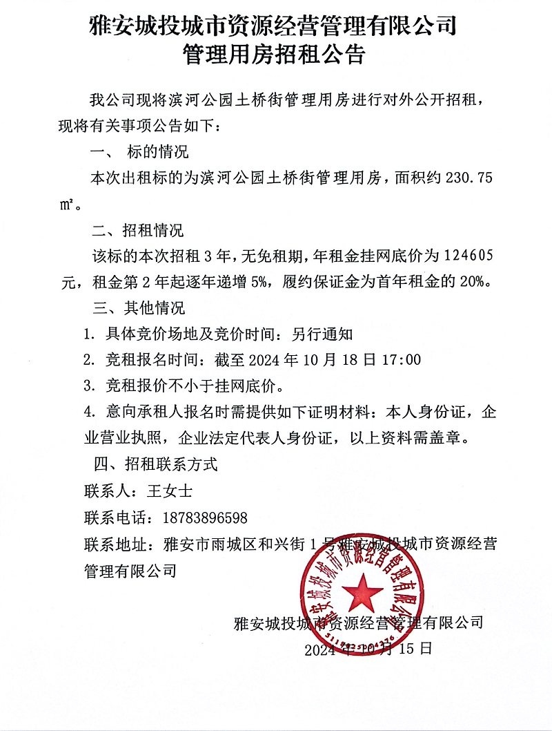 雅安城投城市資源經(jīng)營管理有限公司關(guān)于濱江公園土橋街管理用房招租的公告