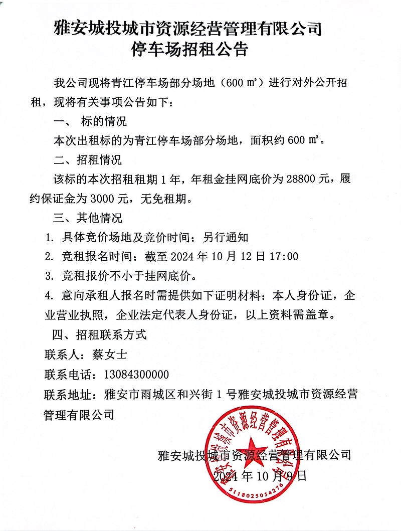 雅安城投城市資源經(jīng)營管理有限公司關(guān)于青江停車場(chǎng)部分場(chǎng)地招租的公告