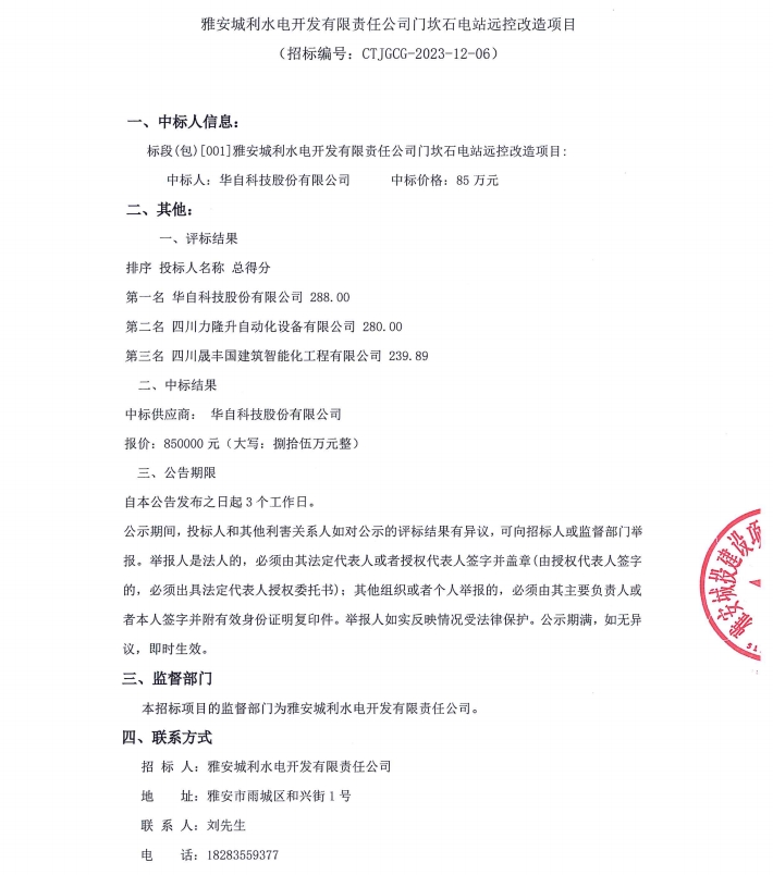 雅安城利水電開發(fā)有限責任公司門坎石電站遠控改造項目結(jié)果公示