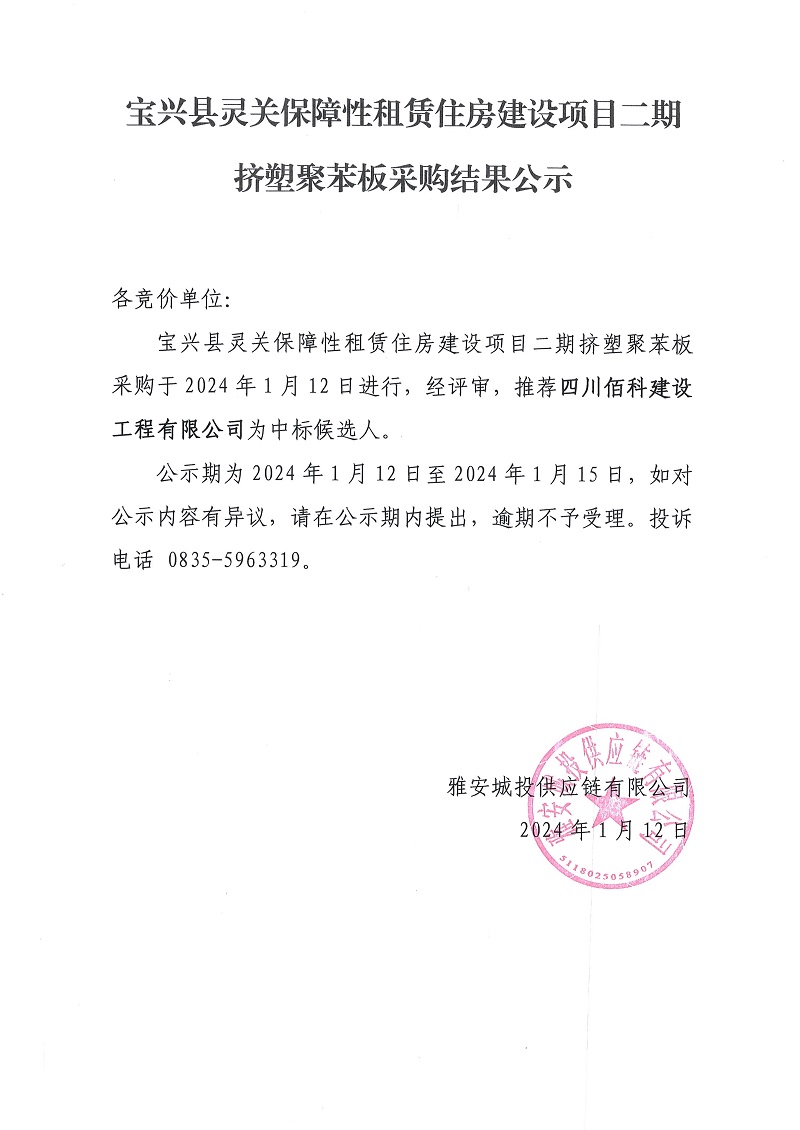 寶興縣靈關(guān)保障性租賃住房建設(shè)項目二期技塑聚苯板采購結(jié)果公示