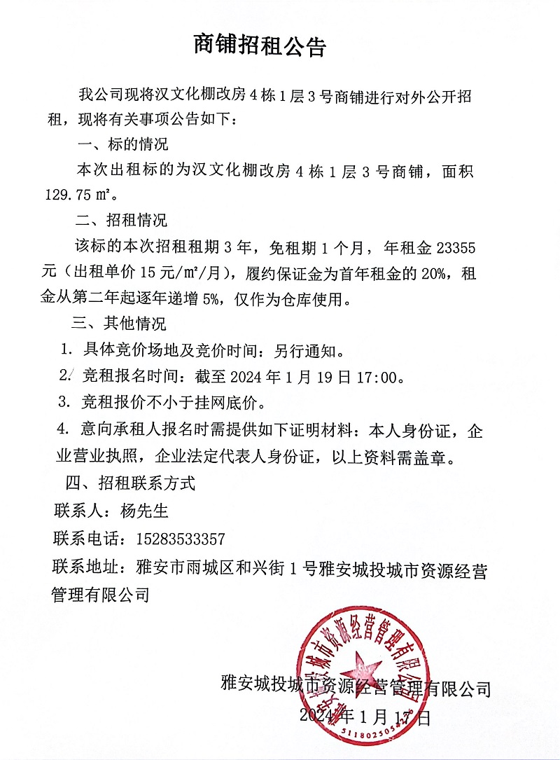 漢文化棚改房4棟1層3號商鋪招租公告