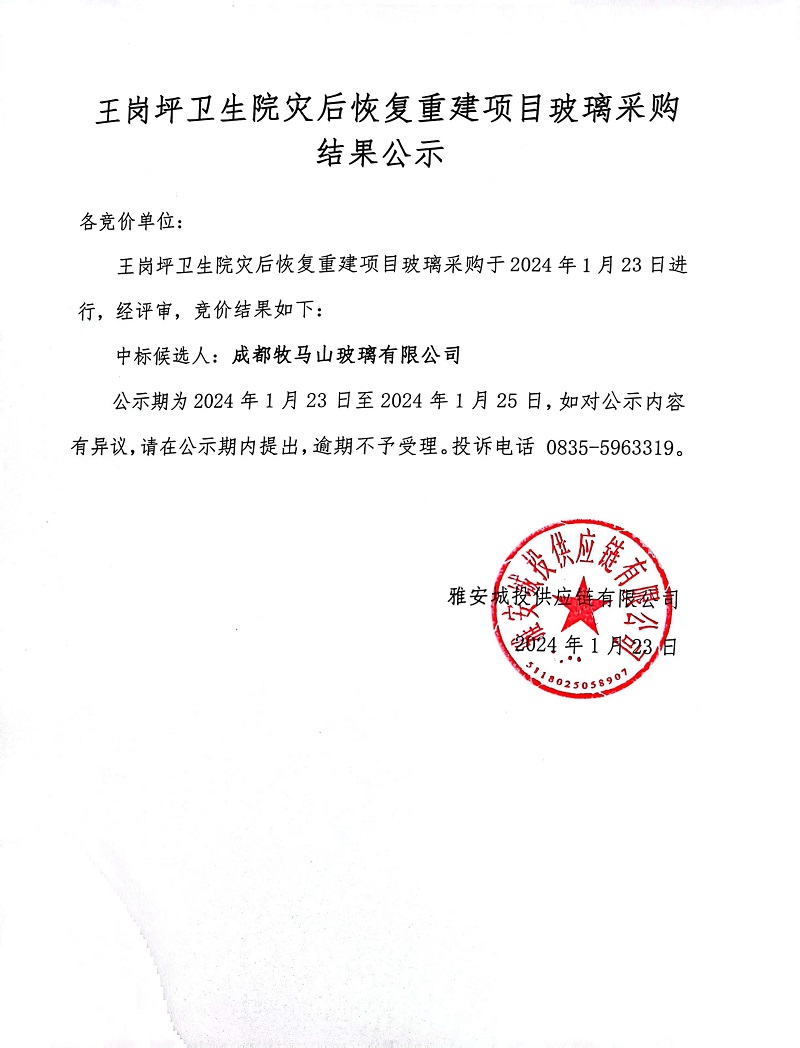 王崗坪衛(wèi)生院災(zāi)后恢復(fù)重建項目玻璃采購結(jié)果公示