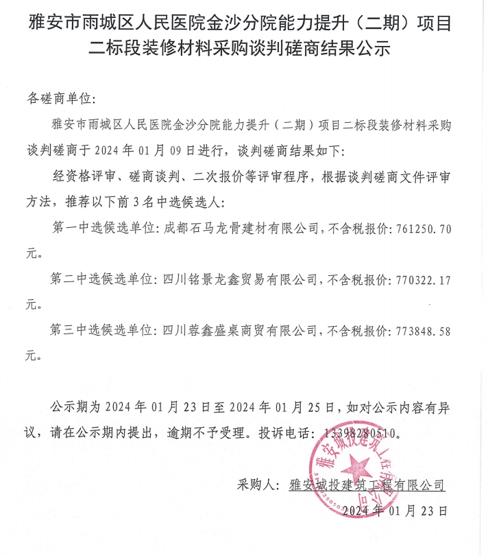 雅安市雨城區(qū)人民醫(yī)院金沙分院能力提升(二期)項(xiàng)目二標(biāo)段裝修材料采購(gòu)談判磋商結(jié)果公示