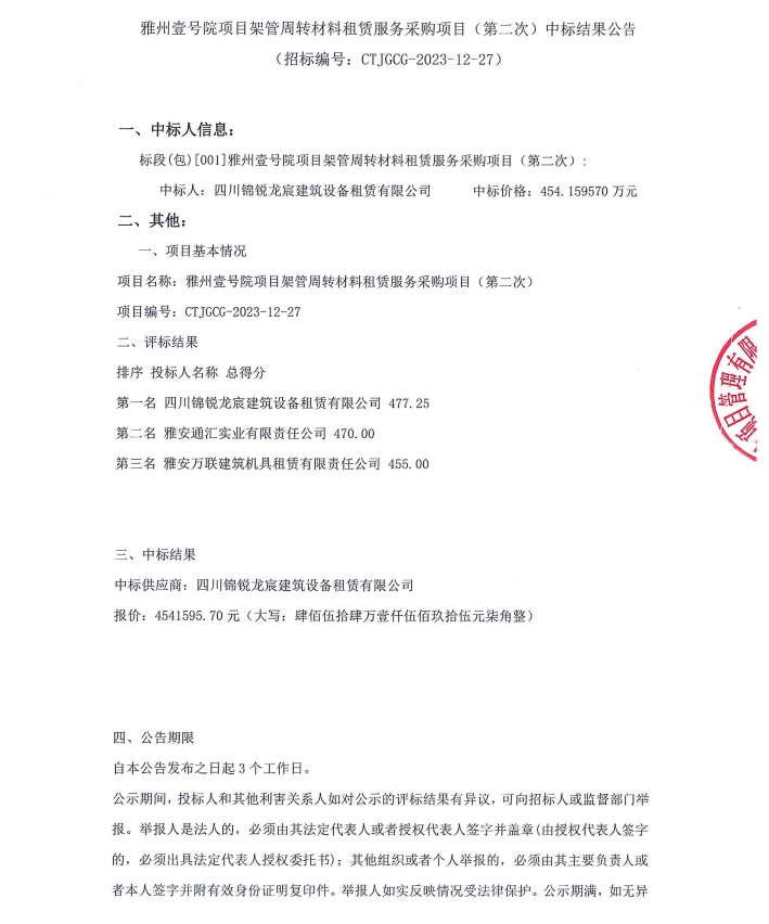雅州壹號院項目架管周轉(zhuǎn)材料租賃服務采購項目(第二次)中標結(jié)果公告