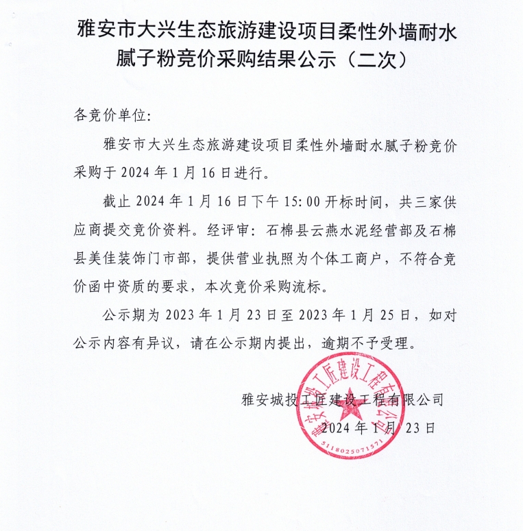 雅安市大興生態(tài)旅游建設(shè)項(xiàng)目柔性外墻耐水膩?zhàn)臃鄹?jìng)價(jià)采購(gòu)(第二次)結(jié)果公示