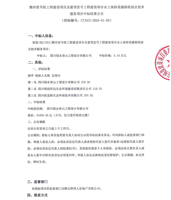 雅州壹號院工程建設(shè)項目及蒙頂壹號工程建設(shè)項目水土保持設(shè)施驗收綜合技術(shù)服務(wù)項目中標結(jié)果公告