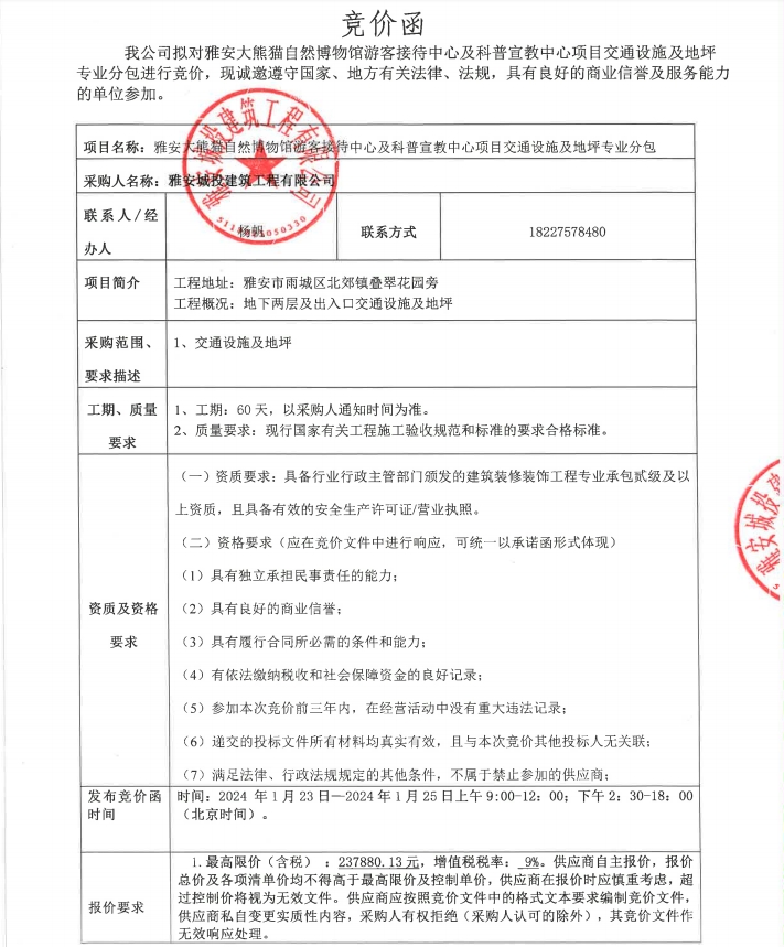 雅安大熊貓自然博物館游客接待中心及科普宣教中心項目交通設施及地坪專業(yè)分包競價公告