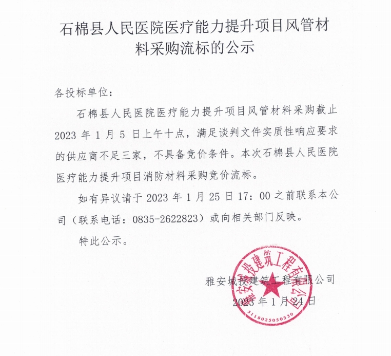 石棉縣人民醫(yī)院醫(yī)療能力提升項(xiàng)目風(fēng)管材料采購流標(biāo)的公示