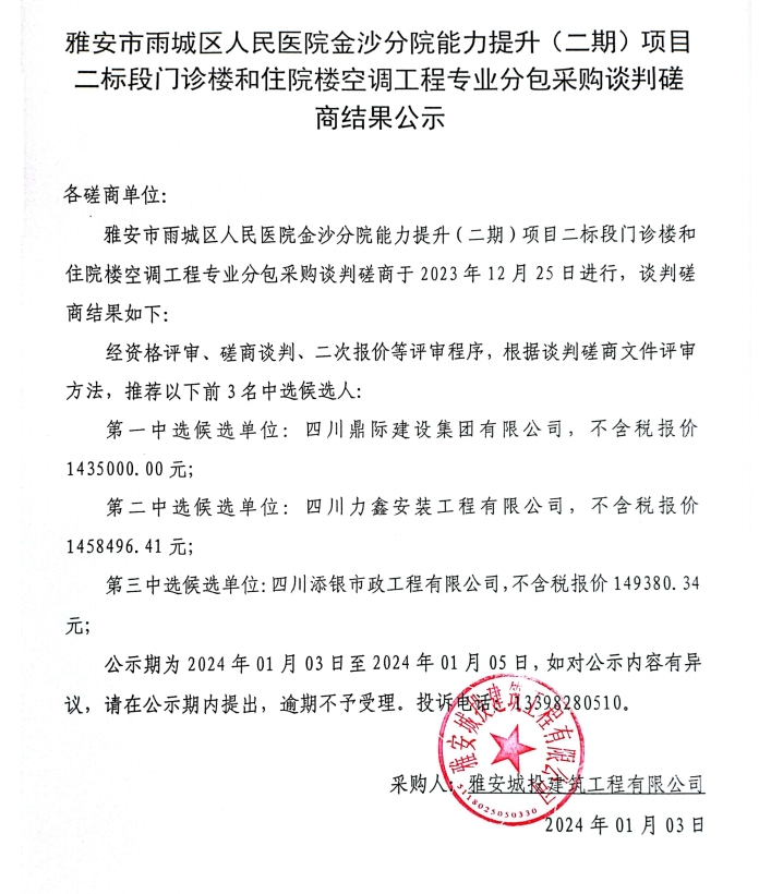 雅安市雨城區(qū)人民醫(yī)院金沙分院能力提升(二期)項目二標段門診樓和住院樓空調(diào)工程專業(yè)分包采購談判磋商結(jié)果公示