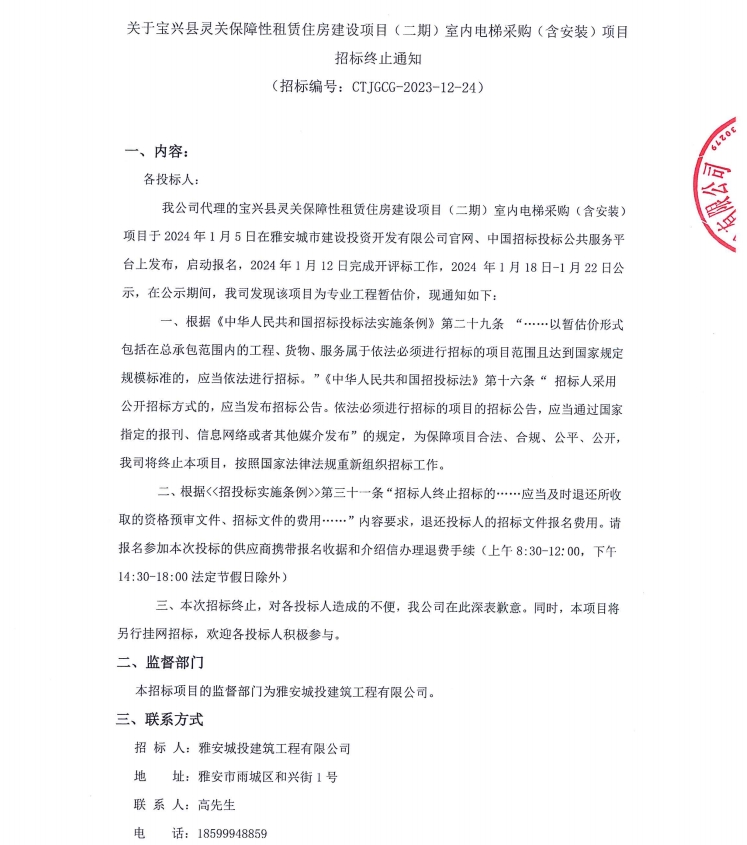關(guān)于寶興縣靈關(guān)保障性租賃住房建設(shè)項(xiàng)目(二期)室內(nèi)電梯采購(含安裝)項(xiàng)目招標(biāo)終止通知