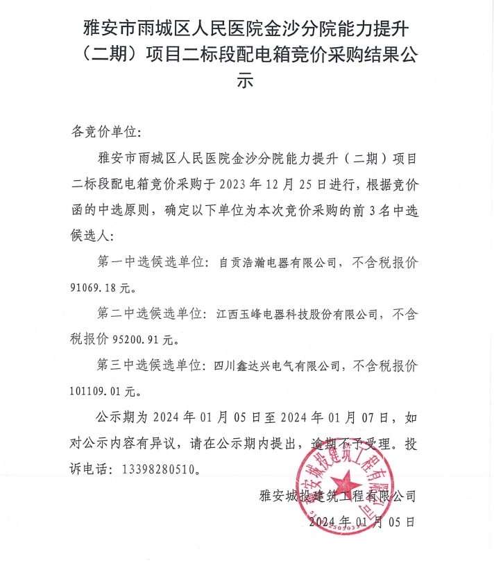 雅安市雨城區(qū)人民醫(yī)院金沙分院能力提升(二期)項目二標(biāo)段配電箱競價采購結(jié)果公示
