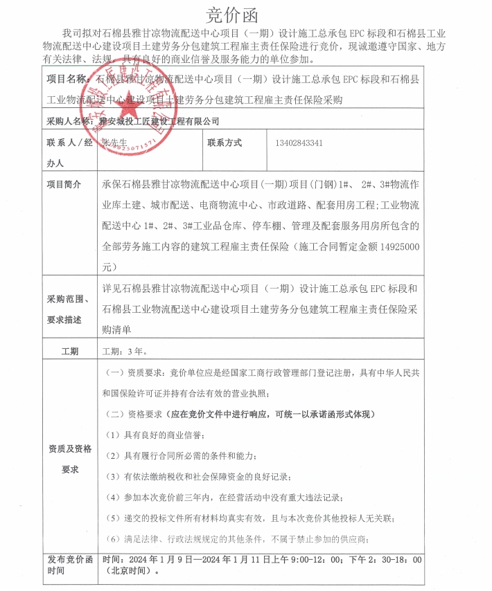 石棉縣雅甘涼物流配送中心項目(一期)設計施工總承包EPC標段和石棉縣工業(yè)物流配送中心建設項目土建勞務分包建筑工程雇主責任保險采購競價公告