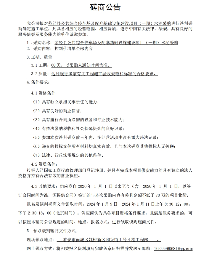 滎經(jīng)縣公共綜合停車場及配套基礎(chǔ)設(shè)施建設(shè)項(xiàng)目(一期)水泥材料采購談判磋商公告