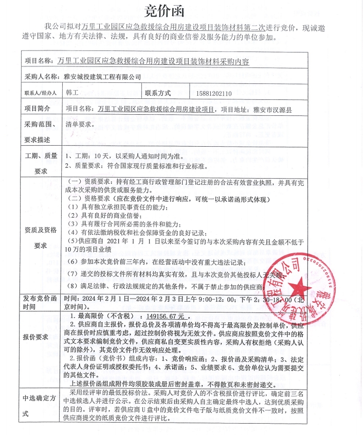 萬里工業(yè)園區(qū)應(yīng)急救援綜合用房建設(shè)項(xiàng)目裝飾材料采購(第二次)競價(jià)公告