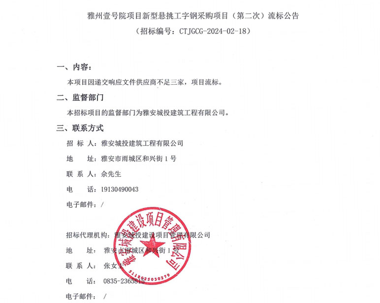 雅州壹號院項(xiàng)目新型懸挑工字鋼采購項(xiàng)目(第二次)流標(biāo)公告