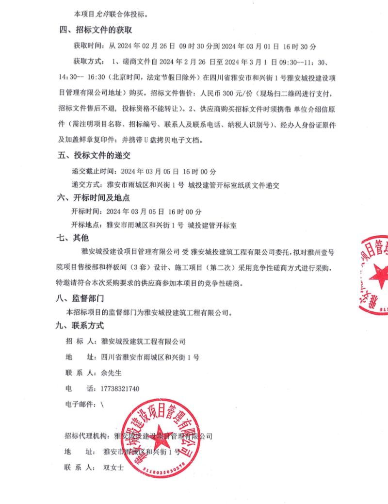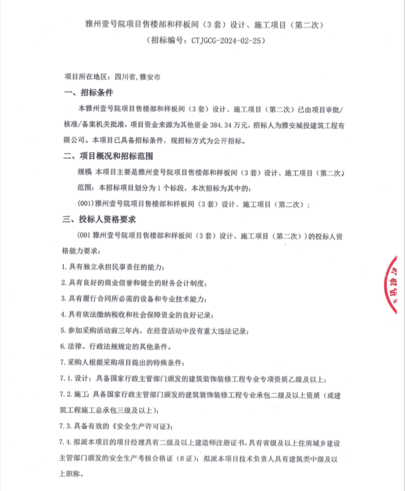 雅州壹號院項(xiàng)目售樓部和樣板間(3套)設(shè)計、施工項(xiàng)目(第二次)公告