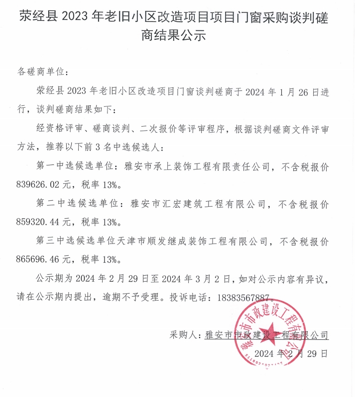 滎經縣2023年老舊小區(qū)改造項目門窗采購采購談判磋商結果公示